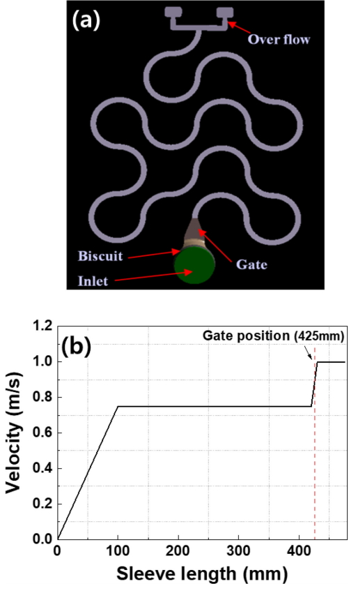 각각 70 mm 및 475 mm이었으며 다이캐스팅 주조압력은 60 MPa로 고정하였다. 저속구간과 고속구간의 사출 속도는 그림 6(b)에 나타낸 바와 같이 각각 0.75 m/sec와 1.0 m/sec로 제어하였다.