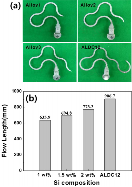 3. Si 함량이 증가함에 따라 합금의 유동성이 증가하였으며, 2 wt%의 Si을 함유한 Al 합금의 유동 길이는 주조성이 우수한 일반 다이캐스팅용