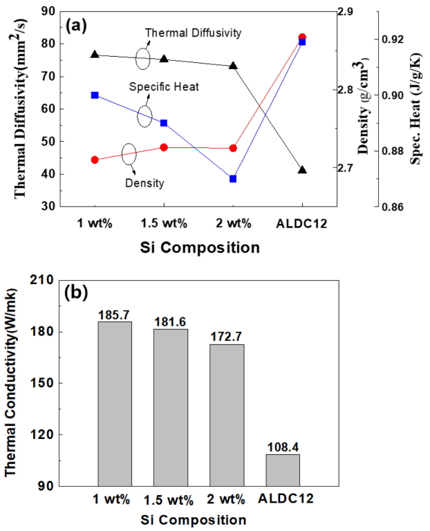 Si 함량이 10 wt% 이상 첨가된 ALDC12의 경우 Si 함량 변화재 대비 매우 낮은 열확산계수를 보였다. 분석값을 활용하여 각각의 시험편에