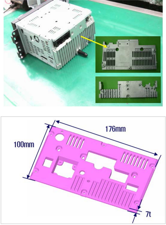 첨가원소에 의한 Al 합금의 열전도성 및 주조성 변화를 관찰하기 위해 자동차 음향기기에사용되는 방열 부품을 다이캐스팅 기법으로 제작하여 성능을 비교