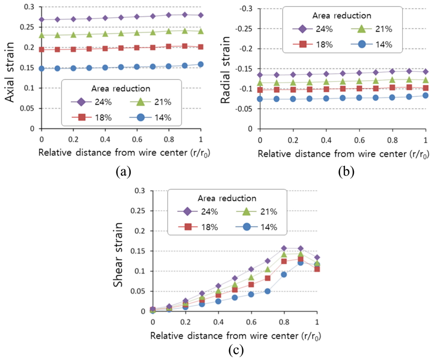 유한요소법을 이용하여 정규 대칭 다이 신선 조건 하에서 선재가 겪는 변형 거동을 해석한 결과 (그림 3), 축방향 및 반지름방향 변형률의 분포는 선재 전체에 걸쳐 균일한 반면, 전단 변형률은 선재의 표면에 가까운 중간 영역에서 중심 및 표면 영역에