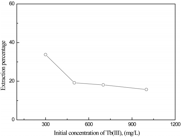 수상에서 테르븀 농도 변화에 따른 추출 거동을 조사하기 위해 테르븀의 초기 농도를 300 ppm에서 1000 ppm으로 변화시켜 0.005 M의 Cyanex