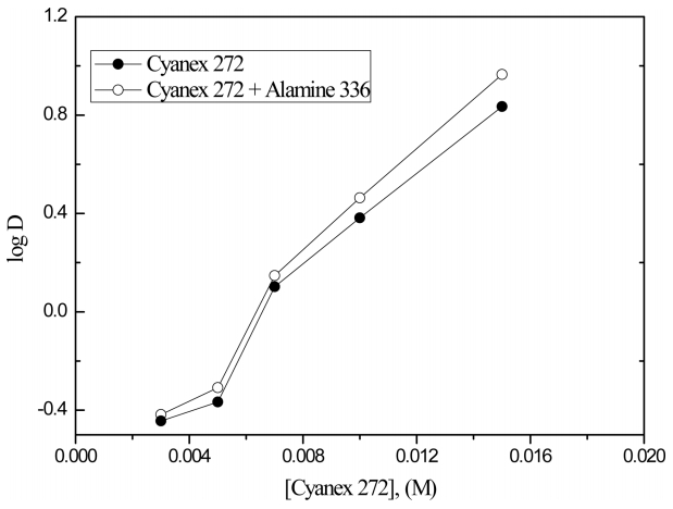 혼합용매의 경우 Alamine 336의 농도를 0.001 M로 고정시켰으며, 본 실험에서 Cyanex 272의 농도를 0.003 M 부터 0.015