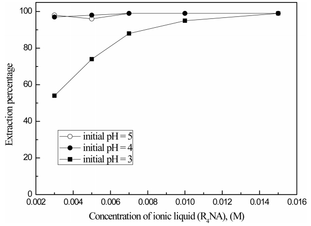 Cyanex 272와 Aliquat 336을 혼합한 이온성액체는 Fortuny등이 보고한 방법으로 제조 하였다 [13]. 0.1 M의 Cyanex 272와 Aliquat 336을 혼합한 다음 0.5 M의 NaHCO3를 첨가하여 수상과 유기상을 1시간 동안 교반시켰다. 교반 후 분액깔대기로 두 상을 분리한 후 유기상에 잔존하는 수소이온과 염소 이온을 제거하기 위해