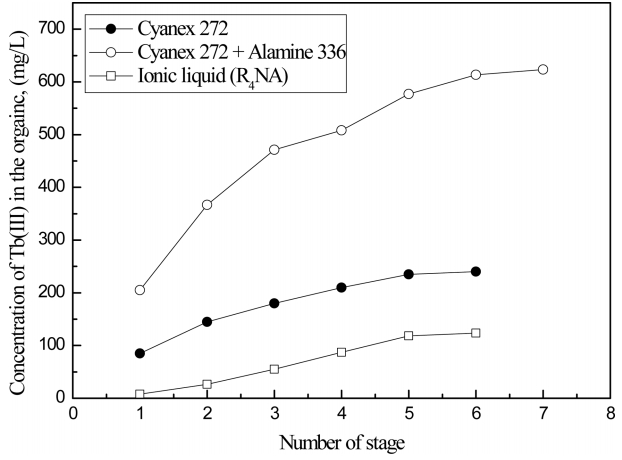 [13]. 그러나 Cyanex 272와 3차 아민의 혼합용매 및 이온성 액체가 테르븀과 같은 중희토류의 추출에 미치는 영향에 대해서는 많은 연구가 보고되지