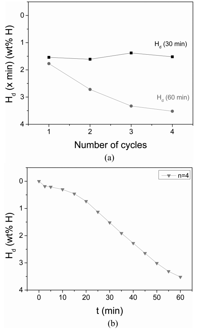 In n=4, the initial dehydrogenation rate was 0.08 wt% H/min and Hd (60 min) was 3.52 wt% H. The results in Fig 4 and Fig 5 show that the cycling effects on the initial hydrogenation and dehydrogenation rates,