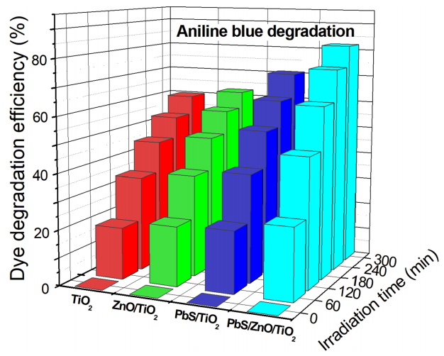 The rate constants for the degradation of Aniline blue were 3.03×10−3 min−1 for the bare TiO2 photocatalyst, 3.27×10−3 min−1 for the ZnO/TiO2, and 4.05×10−3 min−1 for the PbS/TiO2 photocatalyst. These results indicate that the presence of ZnO or PbS nanoparticles
