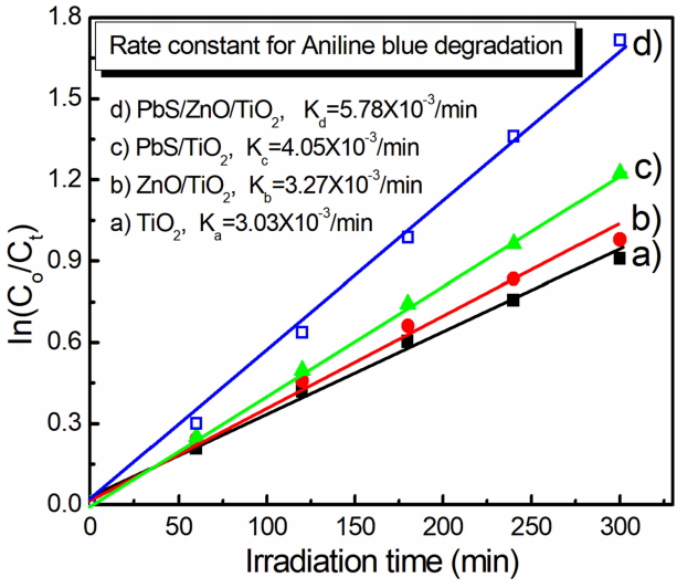 results, the rate constants for the degradation of Aniline blue were found to be 3.03×10−3 min-1 for the bare TiO2, 3.27×10−3 min−1 for the ZnO/TiO2, 4.05×10−3 min−1 for the PbS QDs/TiO2, and 5.78×10−3 min−1 for the PbS QDs/ZnO/TiO2 photocatalysts.