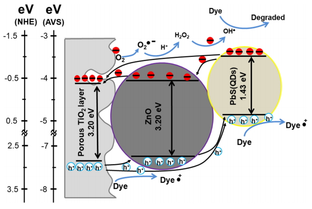 the ZnO and TiO2 catalysts. In the PbS QDs/ZnO/TiO2 heterojunction, the photoinduced electrons are sequentially transferred from PbS