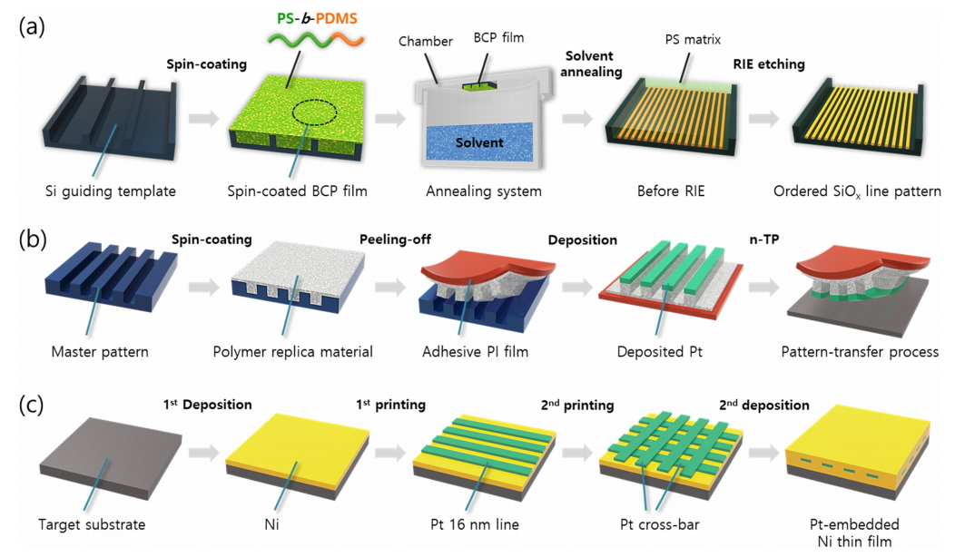 하였다. 구체적으로는, 블록공중합체 자기조립 현상을 통해 초미세 나노 구조 템플릿을 만들었고, 해당 템플릿을 사용하여 패턴전사 프린팅 공정을 통해