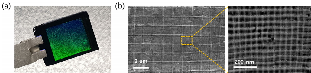 그림 3 (a)는 Pt 크로스-바 패턴이 프린팅되어 있는 기판의 실제 사진 이미지이며, 그림 3 (b)는 해당 패턴의 SEM 이미지 결과물이다. 프린팅된 3차원 다공성 구조물이 전반적으로 잘 형성되어 있음을 확인할 수 있다.