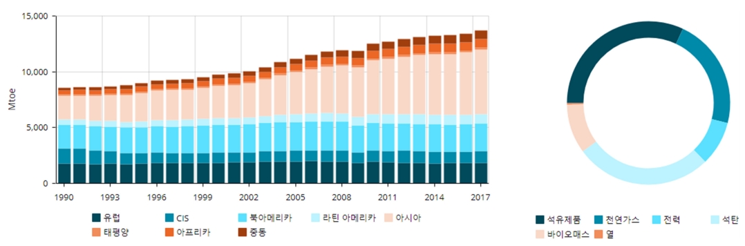 현재 전세계 에너지 소비의 80% 이상은 석유, 석탄, 천연가스 등의 화석연료에 의존하고 있으며, 그 실례로 그림 1에 전 세계 에너지 수요와 각 에너지원의 비율을 나타내었다 [1]. 화석연료의 매장량은 제한적인 반면에 신흥국을 중심으로 전 세계적인 에너지 수요는 지속적으로 증가하고 있고 또한, 화석연료 연소 시 발생하는 이산화탄소