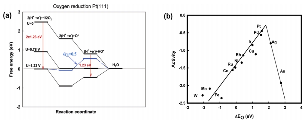 산소흡착에너지와 과전압 간의 상관관계를 구하였는데(volcano plot), 이를 통해 하나의 흡착에너지로도 촉매 활성을 나타내는 과전압을 어느 정도