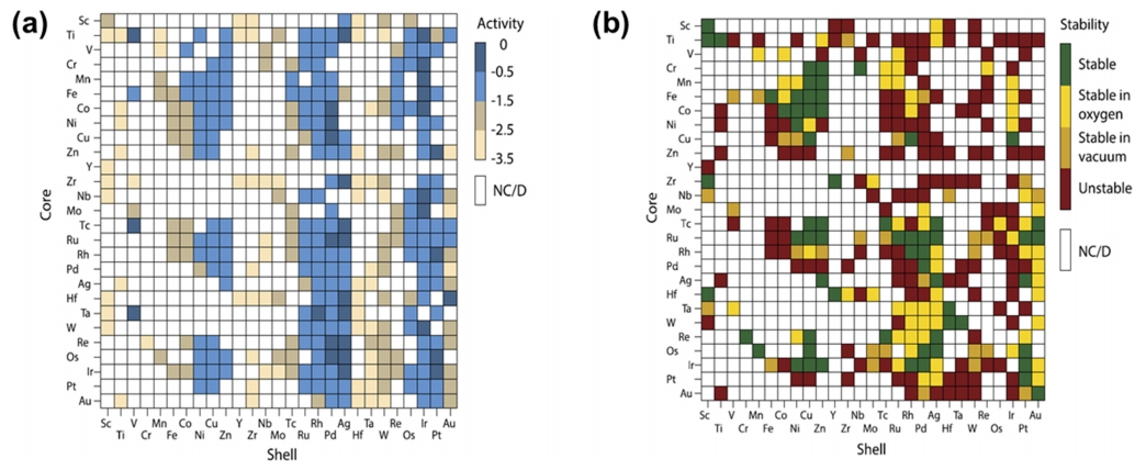 2016년 텍사스대 Henkelman 그룹에서는 다양한 전이금속의 코어@쉘 구조 나노입자에 대하여 수소발생반응(HER)과 산소환원반응(ORR)에 대한
