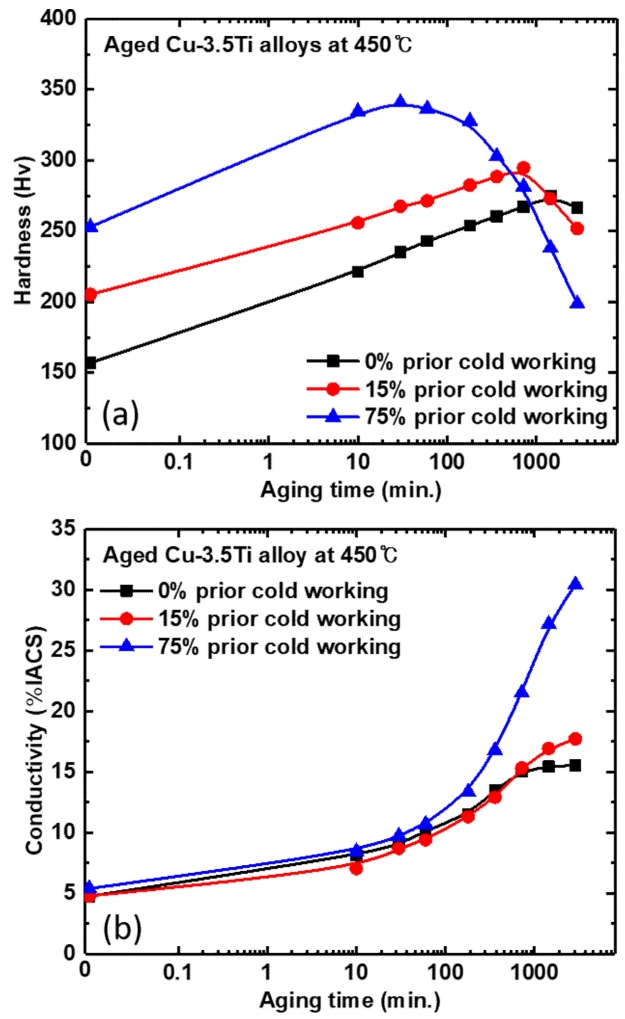 감소율 75% 시편의 경우 시효시간 30분에서 340 Hv, 전도도는 9.7% IACS이며, 반면에 용체화 처리 직후 시효한 시편은 시효 시간 1440분에서