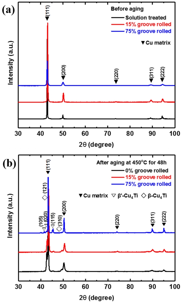 XRD results of (a) solution heat treated and 15%, 75% groove rolled specimens, (b)