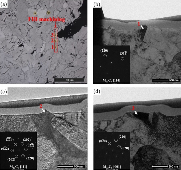 석출물로 판단되는 부위(그림 10a에서 붉은색 사각형)에 FIB를 이용하여 TEM 분석을 위한 시편을 제작하였다. 그림 10b-10d는 그림 10a의 1-3번 위치에서 각각의 TEM 회절 패턴을 분석한 결과로 모두 M23C6 형태의 탄화물로 확인되었다. 또한, 동일한 위치에서 Energy Dispersive X-ray Spectroscopy (EDS)로 정량분석 결과는
