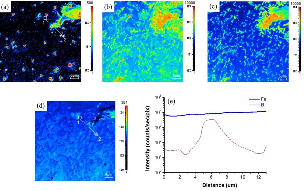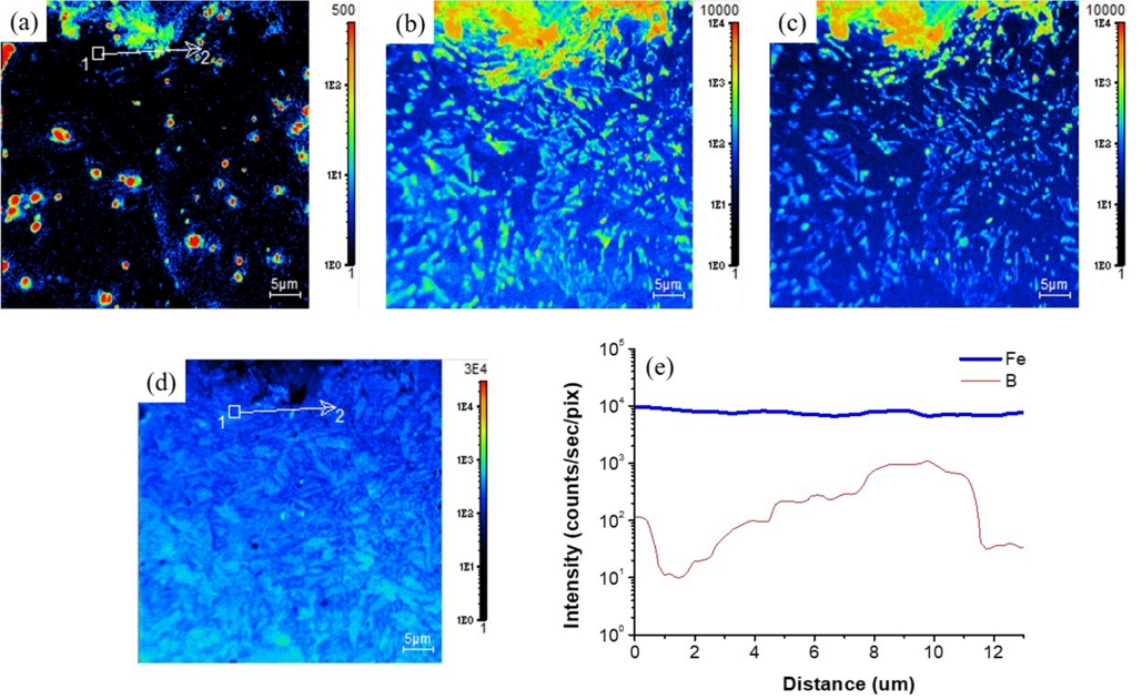 고온균열 측면부 미세균열에 가장 근접한 위치(그림 7b 내부 노란색 사각형)에서 추가적으로 SIMS를 수행한 결과는 그림 9와 같다. 고온균열 측면부 미세균열 근처에도 보론(그림 9a)이 집중 분포되어 있었고, 탄소(그림 9b)와 질소(그림 9c)도 보론의 위치와 유사하게 고온균열 측면에 연결된 미세균열 근처에 집중 분포되어 있었다. 또한, 고온균열 측면부 미세균열 직하의 보론과 철 성분