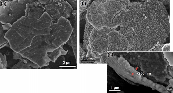 수 있다(그림 1(a)). 이후 반전지를 완속 충전 조건(0.02C)에서 충·방전 진행하여 흑연 음극의 표면을 관찰하였다. 그림 1(b)는 흑연 표면에 형성된 SEI의 형상과 분포로서 SEI는 많은 입자들로 이루어진 얇은 막으로 존재하며 흑연 표면에 균일하게 분포하고 있다. 이 SEI의