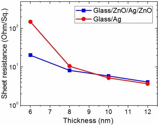 명확하게 드러나듯 8 nm 이하의 두께에서는 Glass/ZnO/Ag/ZnO 전극의 면저항이 Glass/Ag 전극보다 현저히 더 낮은 값을 가지며 그