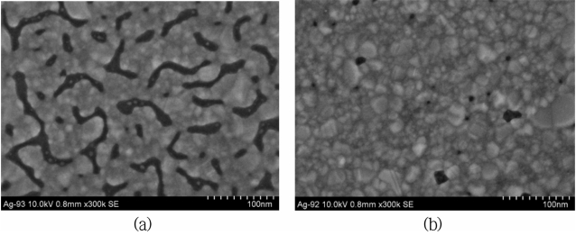 제외하였다. Ag층에 대한 표면 형상은 고분해능 주사전자현미경 (UHR-FE-SEM, Hitachi S-5500)을 사용하여 관찰하였으며, 이때 Ag층의