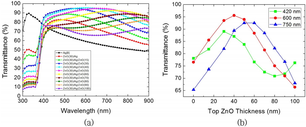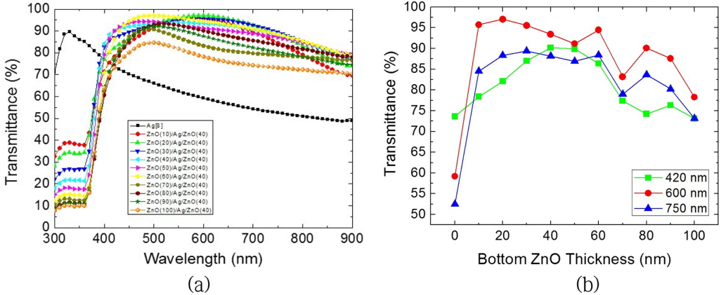 투과도에 더욱더 큰 영향을 끼치는 데, 그 이유는 Glass/Ag 계면과 상부 ZnO/air 계면에서의 빛 반사에 초점을 맞추어 설명이 가능하다.