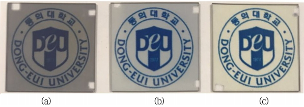그림 6은 Ag 전극, ZnO/Ag 전극, 그리고 ZnO/Ag/ZnO 전극의 투과도를 비교한 사진이다. 상하부 ZnO층이 모두 존재하는 ZnO/Ag/ZnO