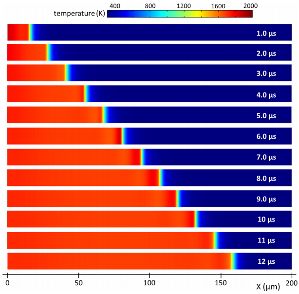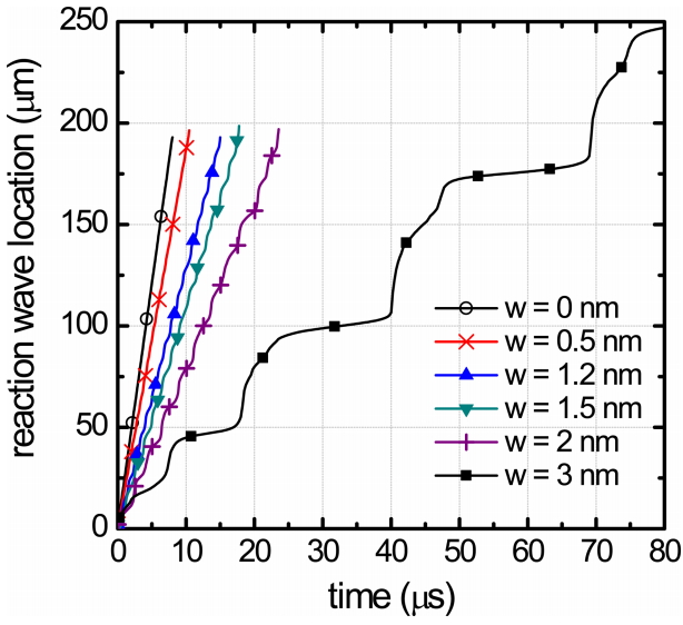 Figure 10 shows the temporal changes of reaction wave speed locations in Al-based NRMF. In