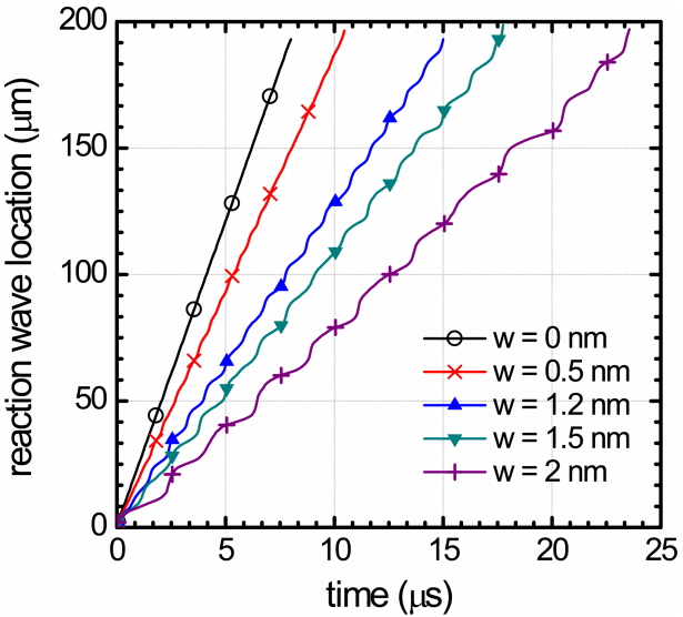 Fig 10, the numerical results of the above case (w = 3 nm) are shown as the time trace of the reaction wave location, along with the