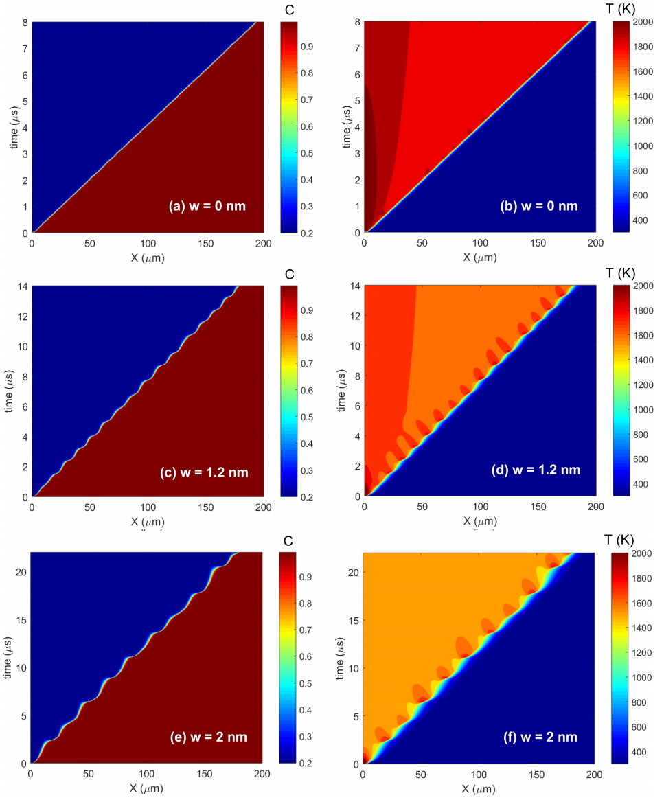 of w = 1.2 and 2 nm, small hot spots behind the reaction wave could be observed, as shown