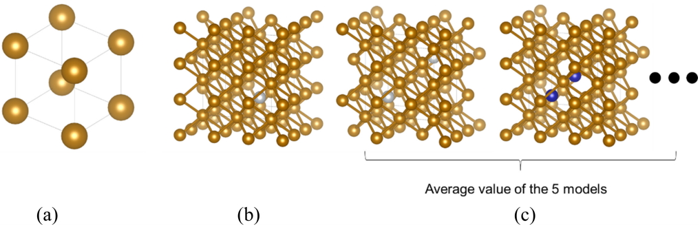 임의로 생성한 5개의 모델에서 계산된 값을 평균하여 사용하였다(그림 1). 탄성 특성과 다결정 특성을 계산하기 위해 각각 strain-stress relation method와 Voight-Reuss-Hill (VRH)