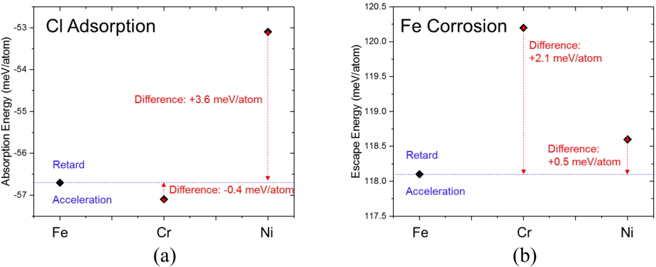 위 식에서 Eads와 Eesp는 크롬과 니켈이 포함된 α-Fe (100) 표면에서의 염소의 흡착에너지와 Fe 원자의 이탈에너지를 의미한다. 또한 EClsurface, Esurface, μCl2은 각각 Cl 원자가 포함된 α-Fe (100) 표면의 에너지, Cl 원자가 포함되어 있지 않은 순수한 α-Fe (100) 표면의 에너지, 염소가스의