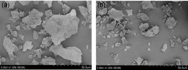 SEM images of mechanically activated black dross after alkaline leaching: (a) without