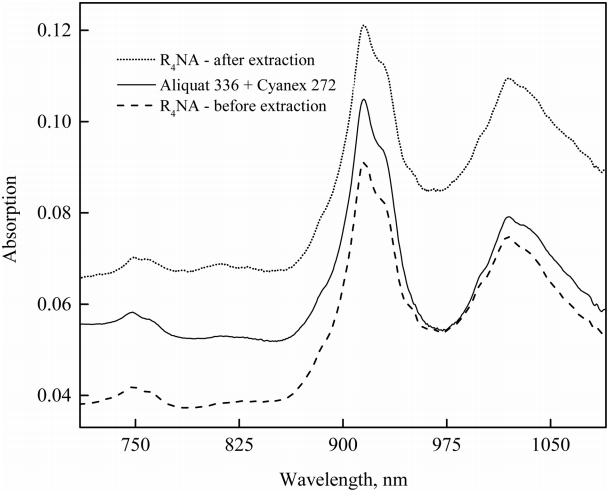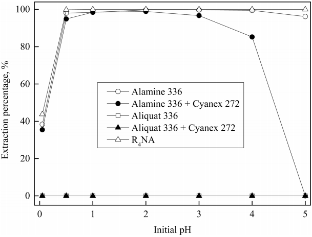 condition: pHinitial = 2.0, [NaCl] = 0.1 M, [R4NA] = 1 M, [Aliquat 336] = [Cyanex 272] = 0.5 M, O:A = 1:1