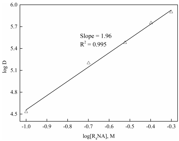 Plot of log D vs log[R4NA]. Experimental condition: pHinitial = 2.0, [NaCl] = 0.1 M, O:A = 1:1.