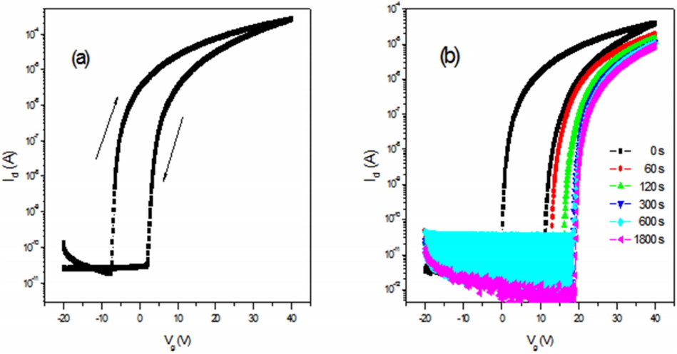 드레인 전압의 증가에 따라 드레인 전류가 게이트 전압에 따른 효과적인 포화 특성을 보여주고 있다. 그림 4a는 히스테리시스 곡선을 보여주고 있다. 히스테리시스는 시계방향 (양방향)으로의 변화가 나타나며, 이는 In2O3 TFT 와 매우 유사한 경향을 나타낸다. 이러한 시계방향으로의 히스테리시스 현상은 반도체나 게이트절연체와 반도체 사이의 계면에서 일어나는 전자의