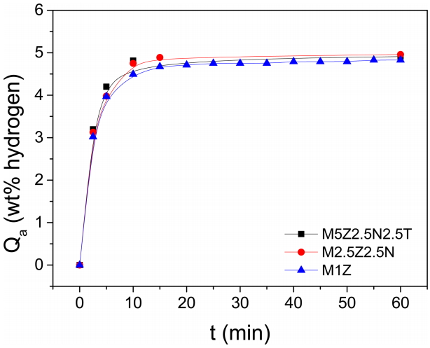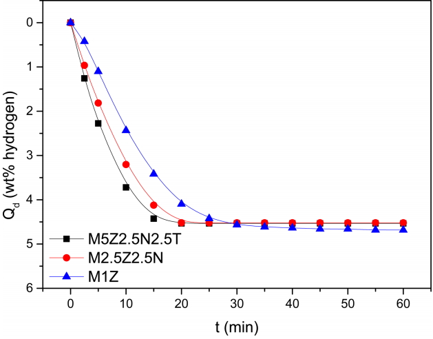 Figure 2 shows the Qd versus t curves at 623 K under 1.0 bar hydrogen at NC=2 for M5Z2.5N2.5T, M2.5Z2.5N,