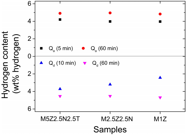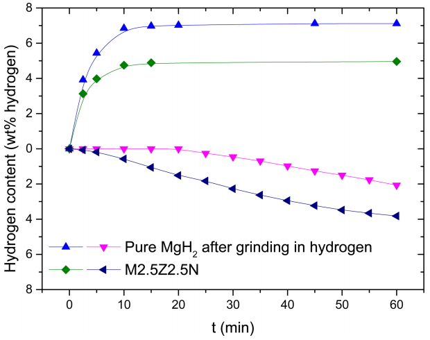 60 min. This indicates that grinding MgH2 in hydrogen significantly increases the initial hydrogen absorption rate and Qa (60 min) and somehow the hydrogen release rate. M2.5Z2.5N has a lower initial hydrogen