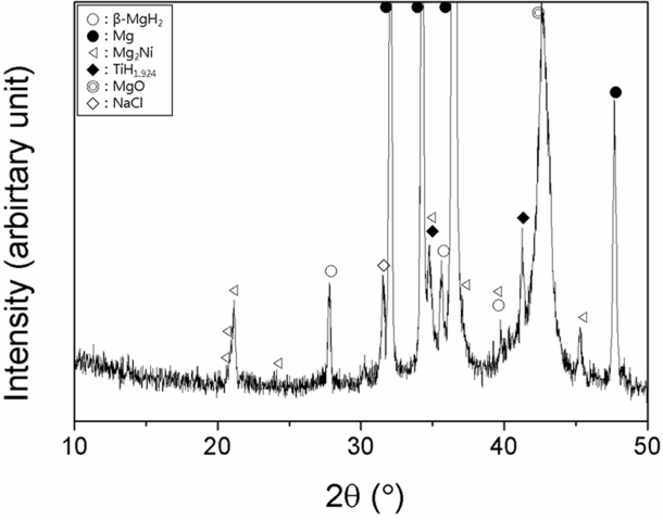 1.0 bar hydrogen at the 11th cycle is shown in Fig 7. The sample contains Mg, β-MgH2, MgO, NaCl, Mg2Ni, and TiH1.924, showing that a small amount of β-MgH2 remains, the Mg2Ni formed from the reaction of Ni with Mg, and the TiH1.924 remains without decomposition even after hydrogen release at 593 K under 1.0 bar