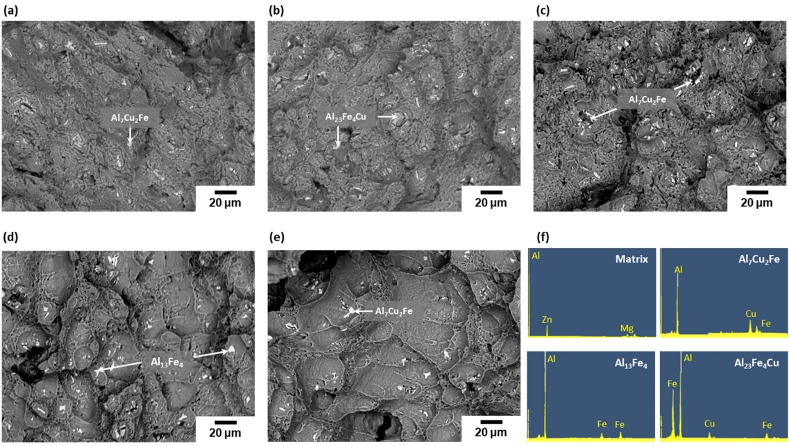 온도가 증가함에 따라 파면의 형태가 더욱 cup and cone 형태에 가까워지며 Al7Cu2Fe, Al13Fe4 Al23Fe4Cu 등과 같이 Fe, Cu 를 포함하는 이차상이 조대한 dimple 내부에서 관찰된다. 이러한 이차상들은 연성 파괴의 균열 개시점으로 작용하였을