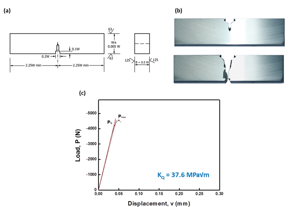 실시하여 이차상이 파괴 거동에 미치는 영향을 자세히 분석하고자 하였다. 그림 12(a,b)에 시편의 도면과 함께 파괴 전 후 시편 사진을 나타내었다. KQ 값은 수식 1과 같이 계산할 수 있으며 PQ 는 그림 12(c) 와 같이 load-displacement curve 에서 정해지는 하중 값, S 는 3점 굽힙 시험에서의 양 끝점 사이의 거리이며, B, BN 은 시편의 형상과 관련된 인자이다. 특히 f(a/W) 에서 a 는 시편의 끝에서 피로 크랙까지의 길이이며 W 는 시편의 파괴 전파 방향 두께를 나타내며