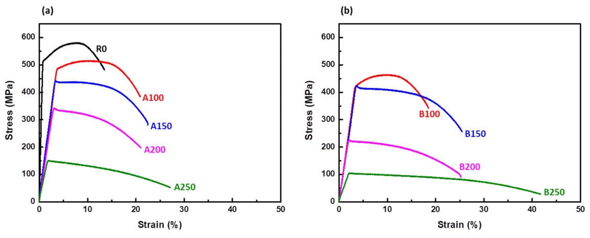 그림 7에 각 온도에서 각각 A 와 B 시편에 대하여 응력-변형률 곡선을 나타내고 항복강도, 연신율을 측정하여 표 2에 나타내었다. 그림 7(a)에서 볼 수 있듯이 R0, A100 시편에서는 소성 변형 구간에서 가공 경화가 진행되었지만 A150, A200, A250시편에서는 항복점에 도달한