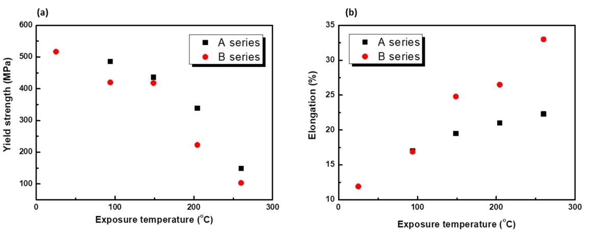 많이 제시되었다 [10-12]. 일반적으로 Cu, Mg와 같은 합금 원소를 첨가하면 Al2Cu, Mg2Si 와 같은 상이 형성되며 고온 강도가 향상된다. 이러한 현상은 주로 200 °C 이하에서 효과적인 반면, 200 °C 이상에서는 강화상들이 급격하게