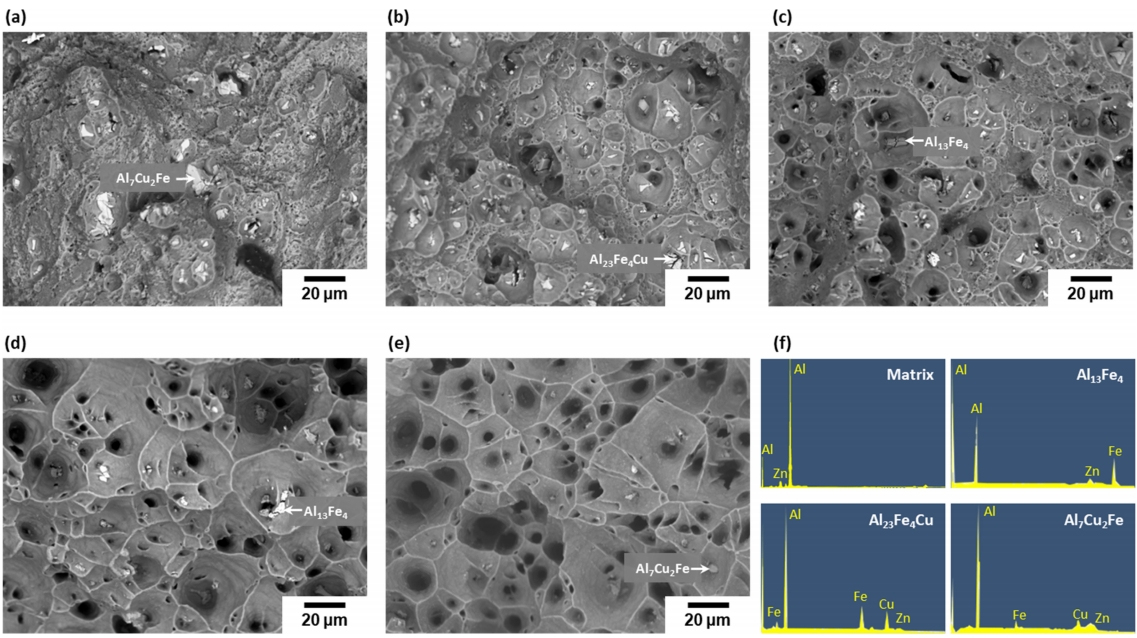 작용할 수 있다고 보고되고 있다 [36]. 본 연구에서 관찰되는 Fe 를 포함한 Al-Cu-Fe 계 이차상들은 크기가 5 μm 이상으로 파괴 개시점으로 작용하며 재료의 인성을 저하시키는