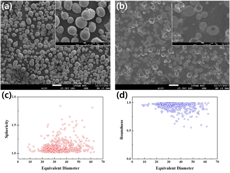 are frequently observed as shown in the cross-sectional microstructures Fig 2 (b). Sphericity Fig 2 (c) and roundness Fig 2 (d) are calculated with reference to P. Singh and P. Ramakrishnan [16], and the closer the value is to 1, the closer the morphology and surface are to