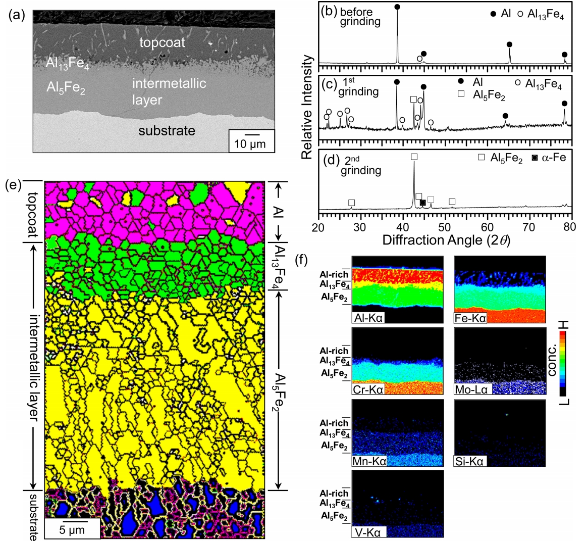 an Al-rich topcoat containing a small amount of Al13Fe4 and Al5Fe2 precipitates, an upper Al13Fe4 layer containing a small amount of Al5Fe2 precipitates, and a lower Al5Fe2 layer were formed on the surface (Fig 1(e)). This phase distribution is also recognizable in the Al map shown in Fig 1(f). The Al5Fe2 layer was thick and somewhat columnar, because orthorhombic Al5Fe2 has 30% vacancies along the c-axis, through which the interdiffusion of Al and Fe