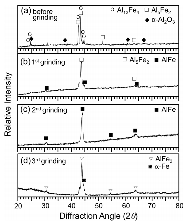while that of Fe increased. Hence, strong Al5Fe2 and weak AlFe peaks came out after the first grinding (Fig 2(b)). Only AlFe peaks came out after the second grinding (Fig 2(c)). Strong AlFe3 peaks came out after the third grinding in addition to the α-Fe substrate peak (Fig 2(d)). In brief, the XRD results indicated the formation of (α-Al2O3 surface scale)/(Al13Fe4, Al5Fe2)-mixed layer)/(AlFe layer)/(AlFe3 layer) on the α-Fe substrate. This is explained further in Fig 3.