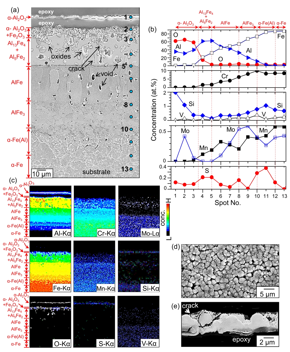 hydrogen released from H2S gas might have dissolved in α-Al2O3 and deteriorated the adherence of α-Al2O3 [11]. Spots 4-5 belonged to the (Al13Fe4, Al5Fe2)-mixed layer (Figs 2(a-b) and 3(a-b)). Spots 5-8 belonged to the AlFe layer (Figs 2(c) and 3(a-b)). The AlFe layer consisted of coarse, columnar grains that aligned along the interdiffusion