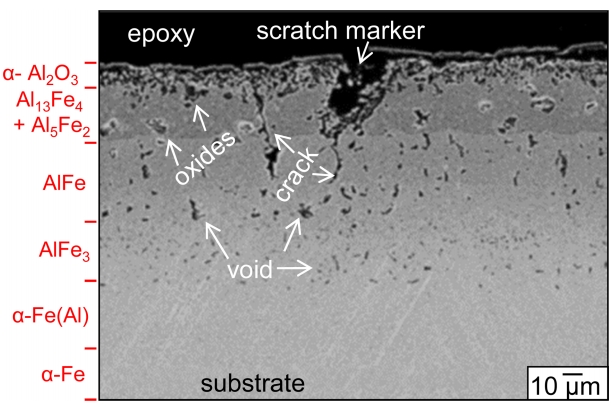 of internal voids as shown in Fig 3(a). The voids appeared smaller down in the coating. Cracks propagated across the (Al13Fe4, Al5Fe2)-mixed layer and AlFe layer (Fig 4). Among Al-Fe intermetallics, Al13Fe4 and Al5Fe2 are brittle, AlFe is ductile, and Al3Fe is the most ductile [25]. The α-Al2O3 surface scale was partially detached, below which the adherent α-Al2O3 layer existed (Fig 4).