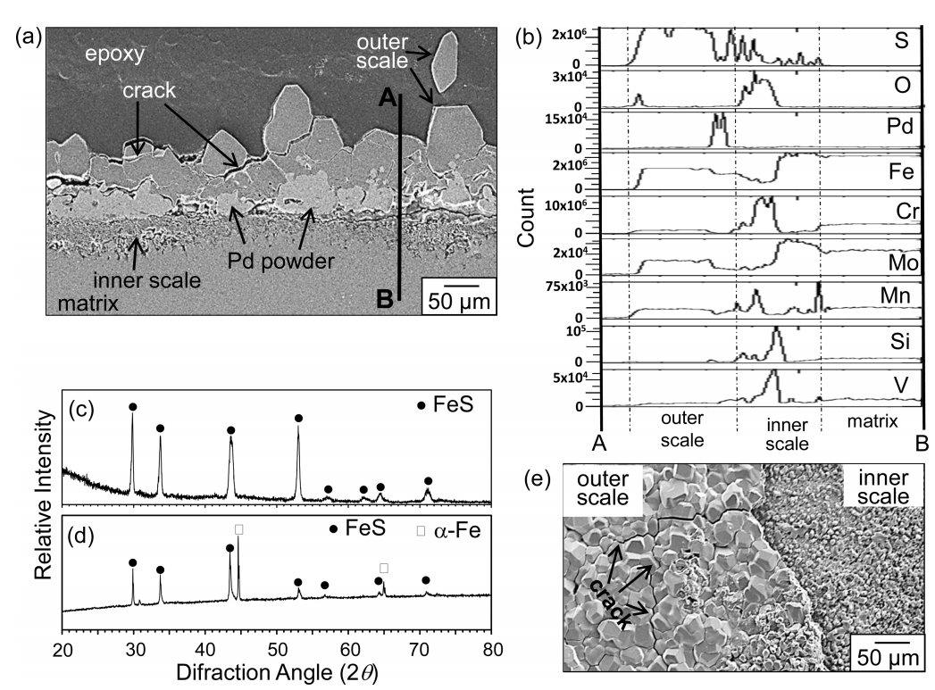 while the inner FeS scale was fine and adherent (Fig 5(e)). Small amounts of Cr, Mo, Mn, Si, and V diffused outwardly to dissolve in the outer